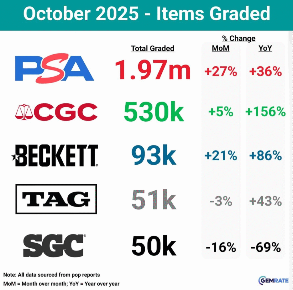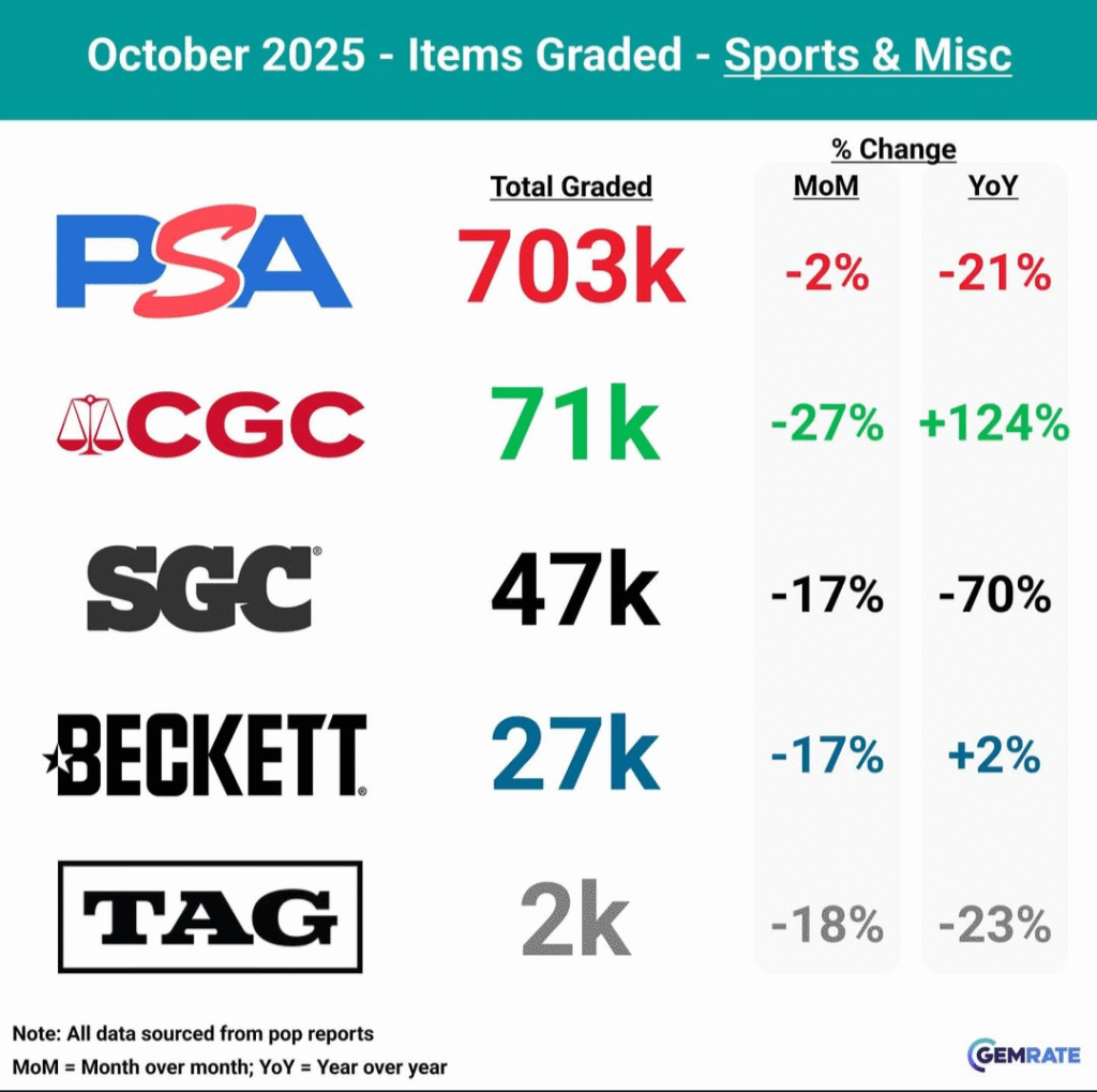 I’m an SGC collector through and through. I bleed SGC black and have been known to wear a tux recreationally. But October volume suggests that September was no fluke. In fact, SGC’s volume declined even further from 60k cards graded in September to just 50k in October. That’s a 16% month-over month decline, and a shocking 69% year-over-year retreat. For context, the “top 3” were all up both month-over-month and year-over-year.