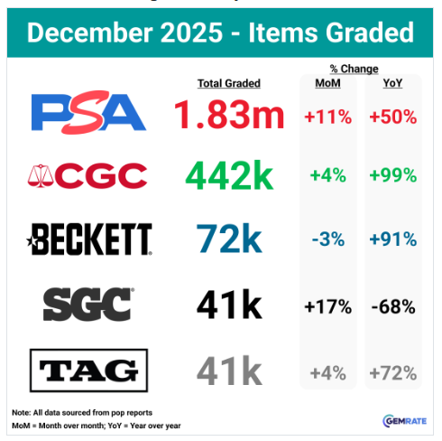 So, what’s in store for card grading in 2026? Now that Collectors own PSA, SGC, and Beckett, will the latter 2 survive and thrive going forward? Will antitrust inquiries amount to anything? Can SGC rebuild–and is that even the plan? Who knows, but let’s look at some data and discuss.